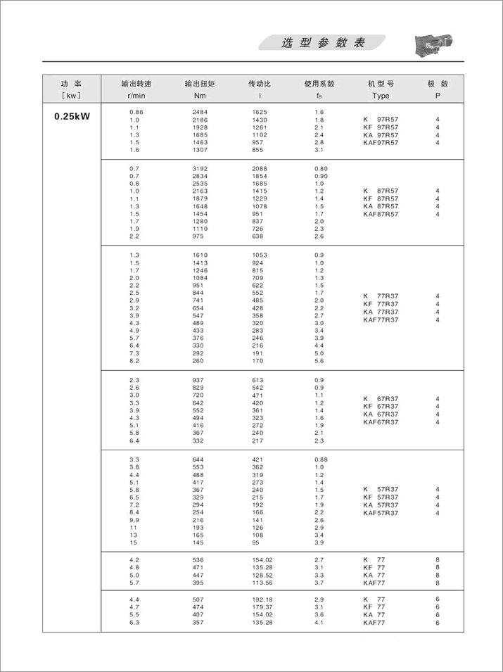 K螺旋錐齒輪減速機選項參數表0.25KW